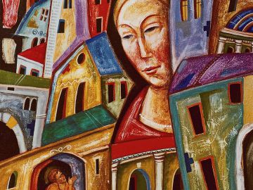 В экспозицию в НГВК вошли порядка сотни картин — есть и питерская тематика, и религиозная, и обращение к западному искусству. Во многих работах присутствует свойственный Вику коллаж, совмещение разных по стилистике образов. Увидеть эти работы можно до 22 марта на первом этаже НГВК.