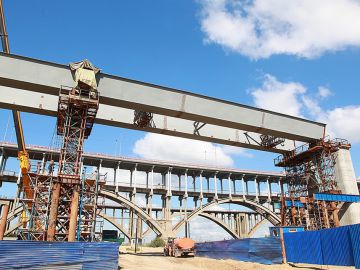По его словам, уже готовы все береговые опоры моста, а строительство русловых опор завершено на 95%. Монтируются арочные сооружения длиной 159 м каждая, которые к концу ноября будут установлены на русловые опоры. После окончания этой операции мост замкнется.