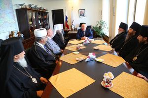 За одним столом Митрополит Нижегородский и Арзамасский Георгий, руководитель Духовного управления мусульман региона Гаяз Закиров, председатель еврейской общины Эдуард Чапрак и Благочинный Православной Старообрядческой церкви Протоиерей Михаил Шашков. Все вместе они одобряют инициативу главы региона Валерия Шанцева по сотрудничеству и благодарят за поддержку социальной и просветительской деятельности религиозных организаций.