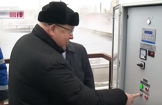 Легким движением руки губернатор Шанцев запускает ни много ни мало новую эпоху в работе Водоканала. Эрлифтный насос на станции аэрации. Он заменит воздуходувную станцию. Воздух под давлением будет подаваться в аэротенки. Благодаря этому стоки будут очищаться значительно лучше. Аэротенки тоже модернизированы. Если не все понимают, что это за слово такое объясним. Проще - это резервуары, в которых активный ил поглощает осадок, еще проще, полезные микробы поедают вредных. Таким образом стоки станут чище.