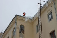 Сейчас, когда наблюдаются осадки при колебании температур от минуса к плюсу, особенно возрастает риск схода снега с крыш, а также образования сосулек. Чтобы этого не произошло, альпинисты убирают снег с кровель. Однако, по словам директора департамента жилья и инженерной инфраструктуры Сергея Синицина, жильцам также стоит обращать внимание на состояние крыш их домов.