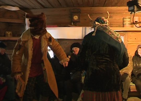 Старинное кукольное представление-вертеп - версия библейской истории о рождении Христа и жестоком царе Ироде, о торжестве добра и наказании зла. Теперь народ из избы выходит на улицу на мороз и танцует-танцует-танцует.