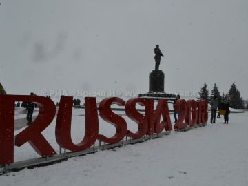 Напоминание о грядущих соревнованиях разместили на площади Минина и Пожарского рядом с памятником Валерию Чкалову, и все желающие могут сфотографироваться с заветными цифрами и буквами.