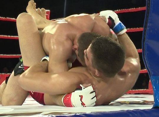 После Максим уходит на удушающий. Не проходит и десяти секунд, как соперник повержен.