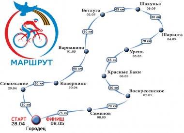 Веломарафон длиною в 700 км будет состоять из 11 этапов и охватит 12 районов Нижегородской области: Городецкий, Сокольский, Ковернинский, Варнавинский, Ветлужский, Шахунский, Тонкинский, Шарангский, Уренский, Красно-Баковский, Воскресенский, Семеновский. Совокупно участие на всех этапах эстафеты веломарафона примут более 300 молодых спортсменов, в возрасте от 14 лет. Участники молодёжного веломарафона совершат остановки в городах и районах Нижегородской области для поздравления ветеранов Великой Отечественной войны, возложения венков к мемориалам «Защитникам Отечества» в преддверии 9 мая.