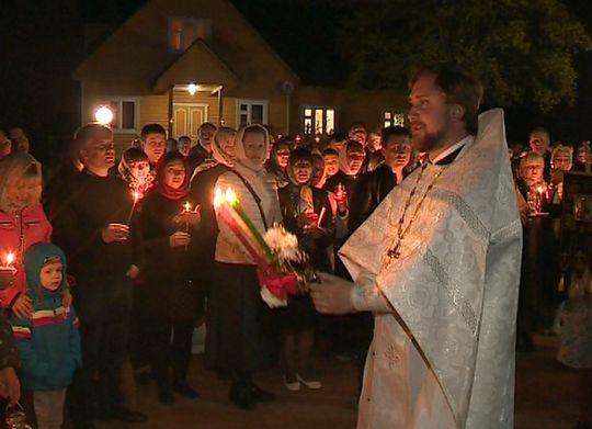 Больше всего верующих собираются ближе к полуночи. В это время начинается традиционный крестных ход. Он символизирует собой шествие Церкви навстречу воскресшему Спасителю. В храме во имя святого князя Владимира в селе Сартаково для участия в крестном ходе собралось около 150 верующих. Сразу после его окончания священники возвещает, пожалуй, главные слова для всех христиан.