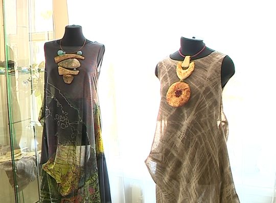 В экспозиции - украшения и платья. Причем все выполнено из ткани.