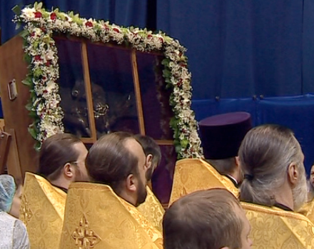 В этом году на ярмарке представлена продукция монастырей и храмов не только из России, но и из Белоруссии, Греции, Израиля, Монголии, Грузии. Всего более двухсот участников. Наше внимание привлекает этот небольшой стенд. Свою главную святыню на Нижегородскую ярмарку привезли послушники монастыря в честь Сергия Радонежского из Черногории. Это мироточащая икона Иоанна Крестителя. Образ, написанный в конце 17 века, постоянно хранится в монастыре. Пару лет назад перед тем, как началась война на Украине, образ стал мироточить.