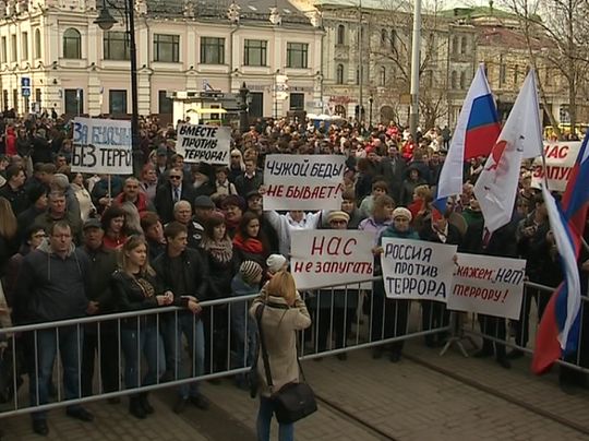 Юлия Короткова, корреспондент: «Площадь Маркина едва вмещает тысячи нижегородцев, которые целыми семьями, с детьми, пришли сюда почтить память жертв теракта в петербургском метро. Среди участников - представители молодежных организаций, политических партий и основных конфессий...»