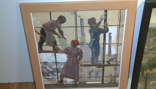 А все это для авторов первого ряда - известных живописцев XX века. Около 50 шедевров Третьяковки и Института русского реалистического искусства откроют нижегородцам историю страны. Выставка так и называется - «Окна в Россию». И действительно, вот вам «Окно Пименова» - экскурс в 70-ые. Рядом, пока еще на полу, «Восстановление Ростсельмаша» Александра Дейнека.