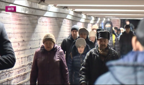 Подниматься и спускаться по лестнице можно только в 2 ряда, и то - еле разойдешься со встречным потоком. Некоторым удается пробираться сквозь затор по пандусу. Попав в тоннель поток людей вынужден идти по суженному коридору. Проход открыт только наполовину. Это та часть, что уже отремонтирована. В толпе много людей с пригородных электричек, через Московский едут на работу из Сормовского и Канавинского районов. Особенно тяжело преодолеть лестницу в такой толкучке пенсионерам.