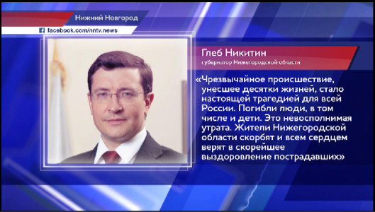 «Чрезвычайное происшествие, унесшее десятки жизней, стало настоящей трагедией для всей России. Погибли люди, в том числе и дети. Это невосполнимая утрата. Жители Нижегородской области скорбят и всем сердцем верят в скорейшее выздоровление пострадавших»