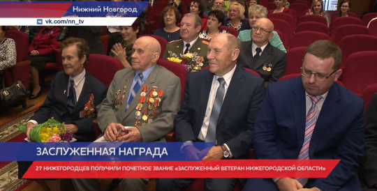 27 нижегородцев из разных районов области и Нижнего Новгорода получили Почетное звание «Заслуженный ветеран Нижегородской области». Торжественное мероприятие провели заместитель губернатора Нижегородской области Андрей Гнеушев и заместитель председателя Законодательного собрания Нижегородской области Ольга Щетинина.