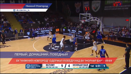 Баскетбольный клуб "Нижний Новгород" одерживает победу над черногорским "Морнар Баром" в первом домашнем матче Лиги Чемпионов ФИБА. Игра разделяется на два отрезка. В первых двух периодах "Нижний" играет на равных с баскетболистами из Черногории. За несколько минут до перерыва счет и вовсе мог быть равным. Но правильный настрой от главного тренера НН Зорана Лукича действует и черно-белые с плюсовой разницей уходят на перерыв.