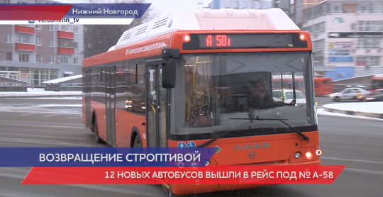 12 новых автобусов вышли в рейс под номером А-58. По поручению Глеба Никитина, подвижной состав на этом маршруте обновлен. Интервальность движения составит 10 - 12 минут. Сам маршрут продлен, теперь муниципальный транспорт ходит от улицы Деловой в верхней части города до микроройна Соцгород - 1 в заречной части.