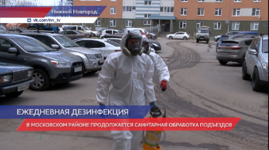 Дезинфекция подъездов в Московском районе начинается с 8 часов утра. В подъезды заходят бригады в специальных костюмах, защищающих от брызг. За спиной ранец с дезинфицирующим раствором, безопасным для людей и животных.