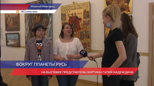 Например, эти картины художника Александра Корнилова. На фоне остальных произведений безусловно выделяются картины нижегородца Галия Надеждина, написанные в стиле исторической древнерусской живописи. На выставке собралась его творческая семья: дочь, которая пошла по его стопам и также стала художницей, племянница с 10-летним сыном Егором. Для спецвыпуска журнала Нижний Новгород: город трудовой доблести они восстановили рассказы о своих предках, в том числе и о Галие Надеждине.
