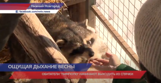 Енот Киря охотно покидает свой домик и идет на запах угощений. Он и две его спутницы в «Лимпопо» проснулись первыми. Кроме них прошлой осень в спячку ушли сурки, бурые и гималайский медведи. Строго говоря, еноты в спячку не впадают - они снижают активность - так сказать спят в пол глаза.