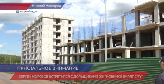 И вновь - на строительной площадке «Новинки Смарт сити». Достройку жилого комплекса обсуждают заместитель губернатора Нижегородской области Сергей Морозов, директор подразделения «Обеспечение завершения строительства» Наталья Сполохова, представители подрядчика и дольщики ЖК.
