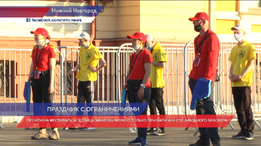 До начала фестиваля «Столица закатов» на Нижневолжской набережной и улице Рождественской много отдыхающих. Ажиотажа на входе на концертную площадку нет. Волонтёры следят за наличием специальных браслетов. Их можно получить, предъявив документ о прохождении вакцинации или действующий пцр-тест.