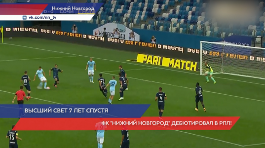 Мы ждали этого момента семь лет. Именно столько наш город не был представлен в главной лиге страны. И вот матч с Сочи. Первый тайм. Нобоа бьет со штрафного. Кончиками пальцев Артур Нигматуллин переводит мяч в перекладину. Вообще в первом тайме мячом больше владеет Сочи. Участник еврокубков, опытный клуб в Премьер Лиге. Но нижегородцы к давлению готовы. Александр Кержаков перед матчем говорит: главное - справиться с волнением. Затем в перерыве центральный защитник Кирилл Гоцук скажет - нам главное забить - и победим. К тому моменту счет ноль ноль. Вообще, в российской истории в стартовых матчах высшего футбольного эшелона нижегородские клубы никогда не проигрывали. Больше того - не пропускали. Локомотив в дебютной игре добыл ничью с Кубанью, Волга обыграла Томь. После перерыва нижегородцы уже осваиваются в новх для себя скоростях и уровне борьбы. Галаджан создает опасный момент. Он делает пас на Шарипова в штрафную, тот дальше на Калинского, но только угловой. Ключевым эпизодом станет выход на замену сначала Сулейманова, а потом Горбунова.