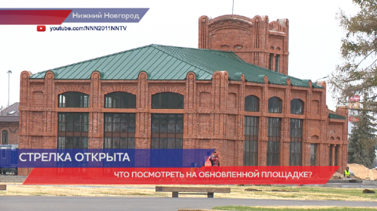Стрелка частично открыта после реконструкции. Здесь появилось много новых объектов. Один из них - деревянный амфитеатр, где расположены большие буквы «Стрелка». Отсюда открывается великолепный вид на слияние двух рек - Волги и Оки. Так же на стрелке установлены две Шуховские башни - это реплики творений знаменитого инженера Шухова. Реконструировано здание старинной фильтрационной станции, которая является объектом культурного наследия. Здесь в 1911 году из-за вспышки холеры впервые за историю России был использован метод обеззараживания воды с помощью хлора. И это спасло большой город от эпидемии. Фасаду вернули прежний облик - из красного кирпича. Продолжаются реконструкция пакгаузов. Вскоре они превратятся в концертный зал на 600 мест и галерею.