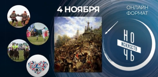 На четвертое ноября в этом году запланирована масштабная акция «Ночь искусств». В Нижегородской области она пройдет преимущественно в онлайн-формате, но ряд учреждений можно будет посетить, причем бесплатно. В их числе - Нижегородский художественный музей. Также в День народного единства состоится большой праздничный эфир, который объединит всю Россию. Нижний Новгород, например, проведет онлайн-фестиваль спортивных искусств народов России. А вообще, эфир в каждом федеральном округе будет посвящен разным темам и сферам жизни. Трансляция начнется в полдень в группе «Нижний 800» в социальной сети «ВКонтакте». Нижегородцы также смогут принять участие в международном этнографическом диктанте.