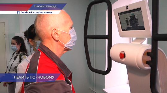 Этот человек выполняет упражнения на моторизированной платформе. Два в одном - и диагностика, и лечение. Здесь несколько режимов - стабильность, координация, сила и так далее.