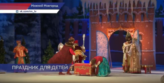 Со сцены дома культуры «Красное Сормово» детей поздравляют с наступающим Новым годом актеры нижегородского театра «Комедия». Сегодня они в образах любимых сказочных персонажей. В том числе, тут есть Снегурочка и Дед Мороз. Что неудивительно. Спектакль посвящен предстоящему новому году.