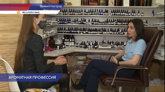 Ольга Абрамова – корреспондент: «Здесь находятся уже готовые ароматы, их 6, один из них посвящен Нижнему Новгороду, в нем автор отразил все культурные особенности нашего города, а называется он «Столица закатов» и возможно в ближайшее время он появится в продаже в парфюмерных магазинах».