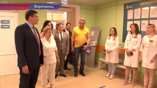 Глеб Никитин - губернатор Нижегородской области: «Это бальзам на душу, что программа модернизации первичного звена, которая запущена по решению президента страны, но часто люди не понимают о чем речь - 500 млрд на страну, что это? Как это? Про что это? Вот конкретный пример. Пришли сегодня - программа 21 года. Полностью реализована. Это, по сути, вся поликлиника была отремонтирована, включая регистратуру, навигацию, расписание, оборудование. Приятно зайти, приятно посмотреть».