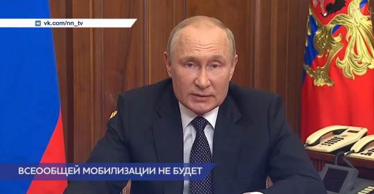 Владимир Путин: «Для защиты нашей Родины, её суверенитета и территориальной целостности, для обеспечения безопасности нашего народа и людей на освобождённых территориях считаю необходимым поддержать предложение Министерства обороны и Генерального штаба о проведении в Российской Федерации частичной мобилизации.
