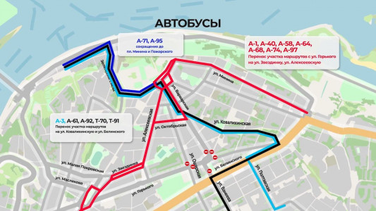 Автобусы и маршрутки А-3, А-61, А-92, Т-70, Т-91 поедут от улицы Белинского до Варварской через улицу Ковалихинскую в оба направления.