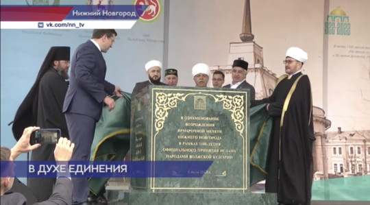 Губернатор Нижегородской области Глеб Никитин и председатель Духовного управления мусульман России, муфтий шейх Равиль Гайнутдин снимают покрывала с первого камня, который будет заложен в основании Ярмарочной мечети на улице Марата. Торжествo по традиции началось с чтения Священного Корана. Возрождение святыни приурочено к 1100 году с момента принятия ислама народами Волжской Булгарии.