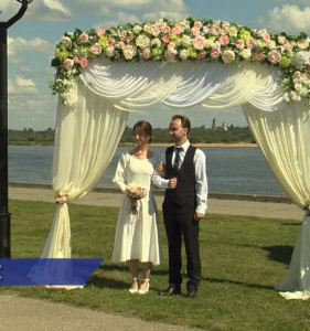 Арка, украшенная россыпью цветов, шикарный вид на Волгу, родные и друзья рядом - все готово к самому волнительному и важному событию в жизни молодожен.