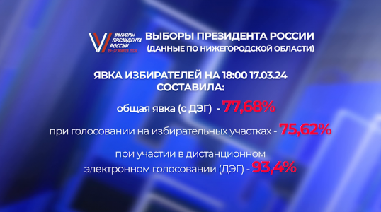 Голосование на выборах Президента Российской Федерации завершилось. В 20 часов ровно в Нижегородской области все участковые избирательные комиссии закрылись и приступили к подсчёту голосов и подведению итогов. По последним данным регионального избиркома, на 18 часов третьего дня общая явка составила более 77%. На избирательных участках отдали свои голоса свыше 75% нижегородцев, а форматом дистанционного электронного голосования воспользовались более 93% от числа заявившихся.