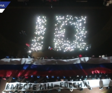 Все собравшиеся выстроились и образовали огромную надпись «10 лет вместе»! Ровно 10 лет назад в Георгиевском зале кремля Владимир Путин подписал документ о принятии двух новых субъектов в состав нашей страны.