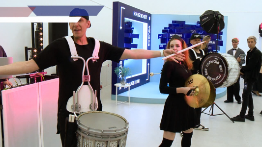 Вот так встречают гостей премии – удивляют, что называется, с порога. Здесь эффектные барабанщики, художник Спич верхом на «собаке» и, конечно, роскошная фотозона. На ней-то и становится видно, насколько звёздный и яркий вечер в Пакгаузах.