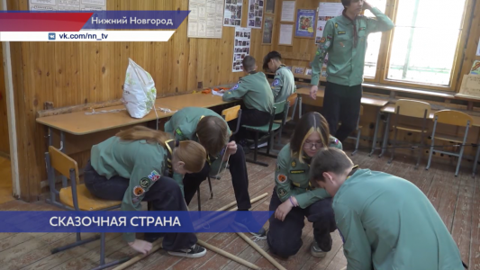 Утренняя линейка скаутов в пришкольном лагере. Здесь готовятся к летнему слёту «Ветлуга» — учатся сборке палаток, вязанию узлов и работе с картами.
