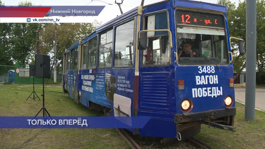 «Трамвай Победы» отправляется в путь. Торжественно, под песни военных лет и слова благодарности всем труженикам фронта Горьковской области. Этот тематический трамвай будет работать на маршруте №12. На бортах вагона изображена продукция заводов «Красное Сормово» и «Сокол» — подводные лодки и самолёты.