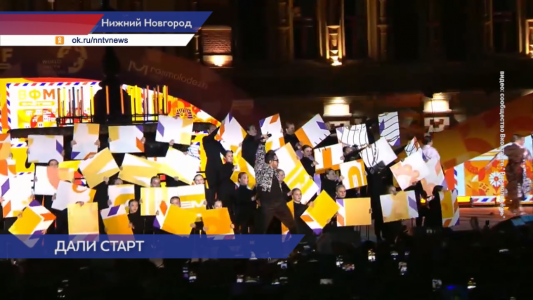 Вот так ярко, на одной из главных площадок столицы Приволжья — Нижегородской ярмарке, Всемирный фестиваль молодёжи открывает российский актёр, певец, теле- и радиоведущий Тимур Родригез. Помогают ему в этом лучшие творческие коллективы региона.