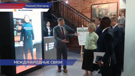 Дальше делегацию встречает виртуальный Максим Горький. Общение проходит в туристско-информационном центре. Здесь же Юрий Шалабаев от имени администрации и всех нижегородцев подчеркивает важность связей с Габонской Республикой.