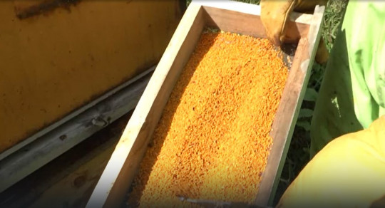 Это не привычный нам мёд, а пыльца. Её производят пчёлы на пасеке Андрея Телушко. За сезон Андрей со своей семьёй — а на пасеке с ним трудятся жена и дети — с двухсот ульев собирают порядка четырёх тонн пыльцы. И над этим трудятся сотни тысяч пчёл.