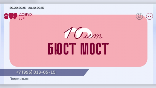 С течением времени главная цель проекта так и не изменилась — привлечь внимание женщин к проблеме рака молочных желез. Для этого в 2015 году организаторы собрали более 3000 бюстгальтеров и построили символический бюст-мост через Волгу. Сейчас проект вышел на международный уровень, а мероприятия не ограничиваются Нижегородской областью. Акция реализуется и в других регионах нашей страны. За десять лет проверку прошли уже более 300 тысяч женщин.