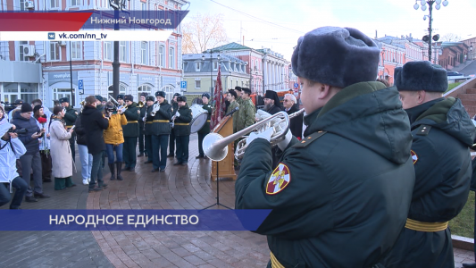 Акция стартует с площади Народного единства. Именно здесь земский староста Козьма Минин призвал народ к сплочению и сбору пожертвований для ополчения. Участники акции возложили цветы к памятнику, особую торжественность событию придал чин окропления копии знамени Народного ополчения.