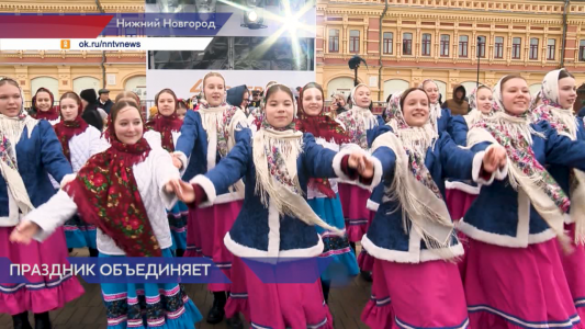 Колоритные костюмы, яркие ленты, атмосфера дружбы и единства. На Нижегородской ярмарке — федеральная акция «Хоровод». Представители разных народов объединяются в общем кругу, держатся за руки и поют известные русские песни.