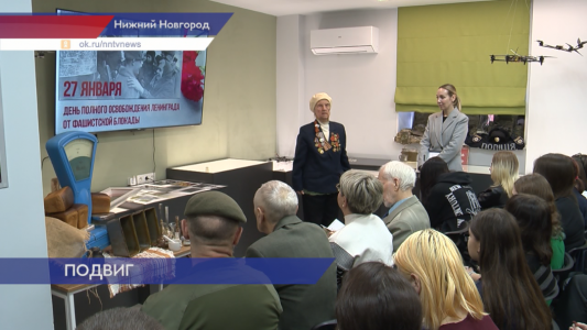 «Мероприятие, посвящённое памяти блокадников, — "Блокадный хлеб" проходит в патриотическом пространстве "Защитники Отечества". Студенты общаются с пережившими те тяжёлые годы — Зоей Ивановной Беловой и Владимиром Михайловичем Абрамовым.