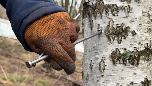 «После сбора берёзового сока очень важно обработать место надреза, чтобы дерево не заболело. Обычно это делают глиной или садовым варом».