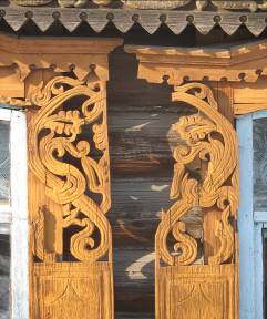 четким узором выделяются на старых срубах дома. Резное обрамление ставен и фасада