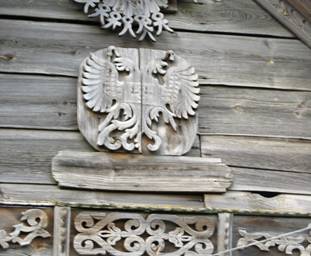 династии Романовых присутствует и на резьбе дома № 58 в деревне Болтино, но